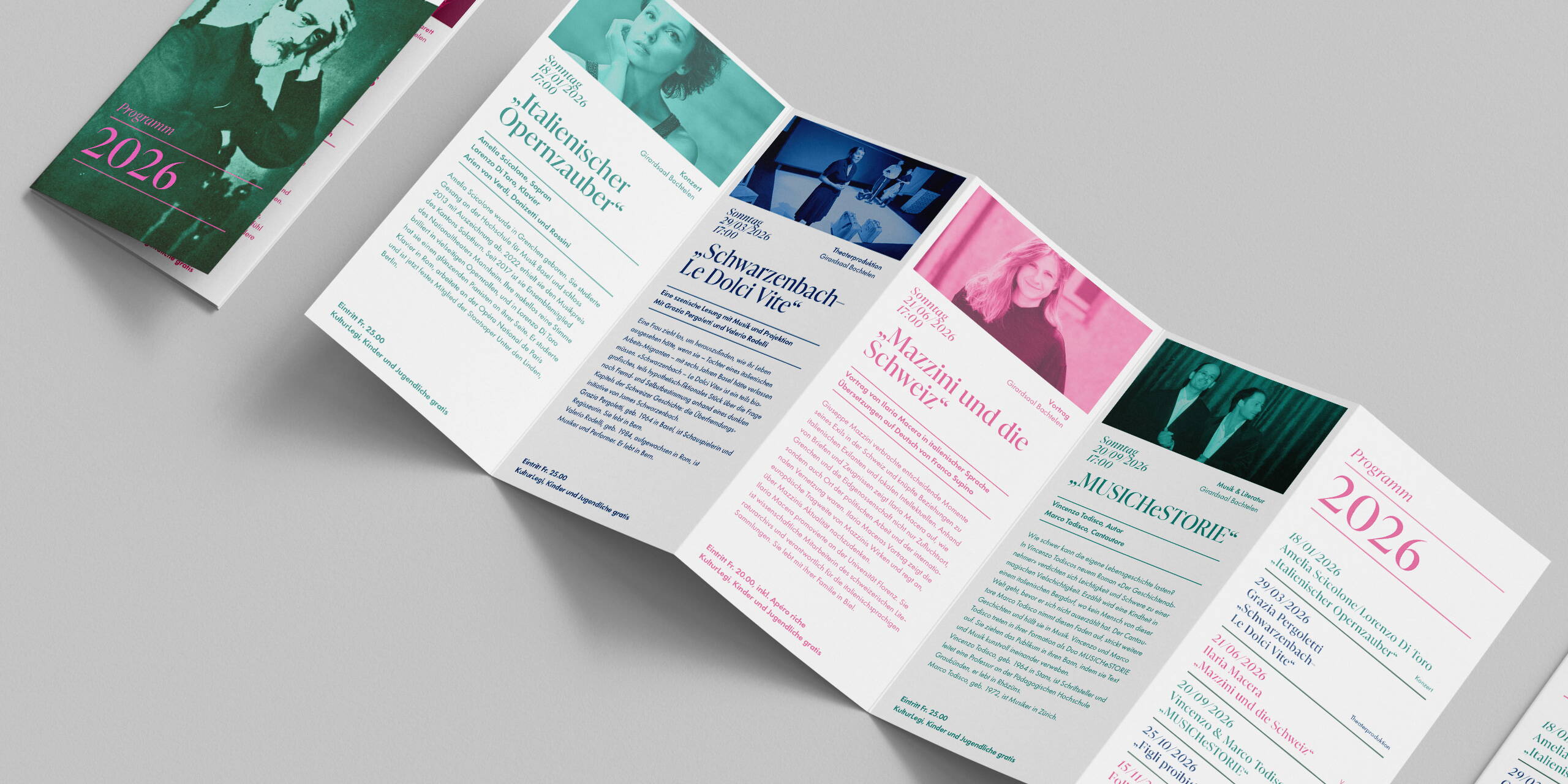 Ein Jahresprogramm als Falzflyer weist auf die abwechslungsreichen Anlässe hin. Der durchgängige Farbcode wurde angelehnt an die italienische Flagge und das Mazzinizimmer, aber modern interpretiert. So wird aus sehr unterschiedlichem Bildmaterial eine Einheit.